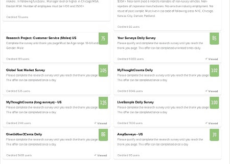 The green surveys are kind of hard to do. Sometimes I will get a survey to complete, and sometimes I wont. And it takes more time than it should to complete them. So I typically avoid them and you should too. The Daily Gold surveys are where the points are at. These are the research surveys that will pay you the majority of your points. I will go over the Gold Surveys later. The Your Surveys are also where the points are at. These are very easy research surveys and I highly recommend that you do these. And they pay out 85 points. The Silver Surveys are what I refer to as the high roller surveys. They payout from 50 points to over 900 points however, they are a gamble. And by a gamble, I mean you are gambling a little bit of time and the right information to get qualified. If you get disqualified, then you lose out on the big points that the research survey promises to payout. I do the Silver Surveys from time to time and its a great way to get big points. The Opinion World surveys are good too. They payout 60 points a survey but sometimes they can get tedious to complete. I also do these from time to time. Peanut Labs is more of an annoying offer section that we will avoid for now. I only do offers on there from time to time if I need a couple of points. uSamp is also the same as Silver Surveys. And lastly, Precision is more of personalization surveys. They are research surveys that are relevant to you and they are kind of like the Silver Surveys in the sense that they payout big and that they are targeted towards certain people.